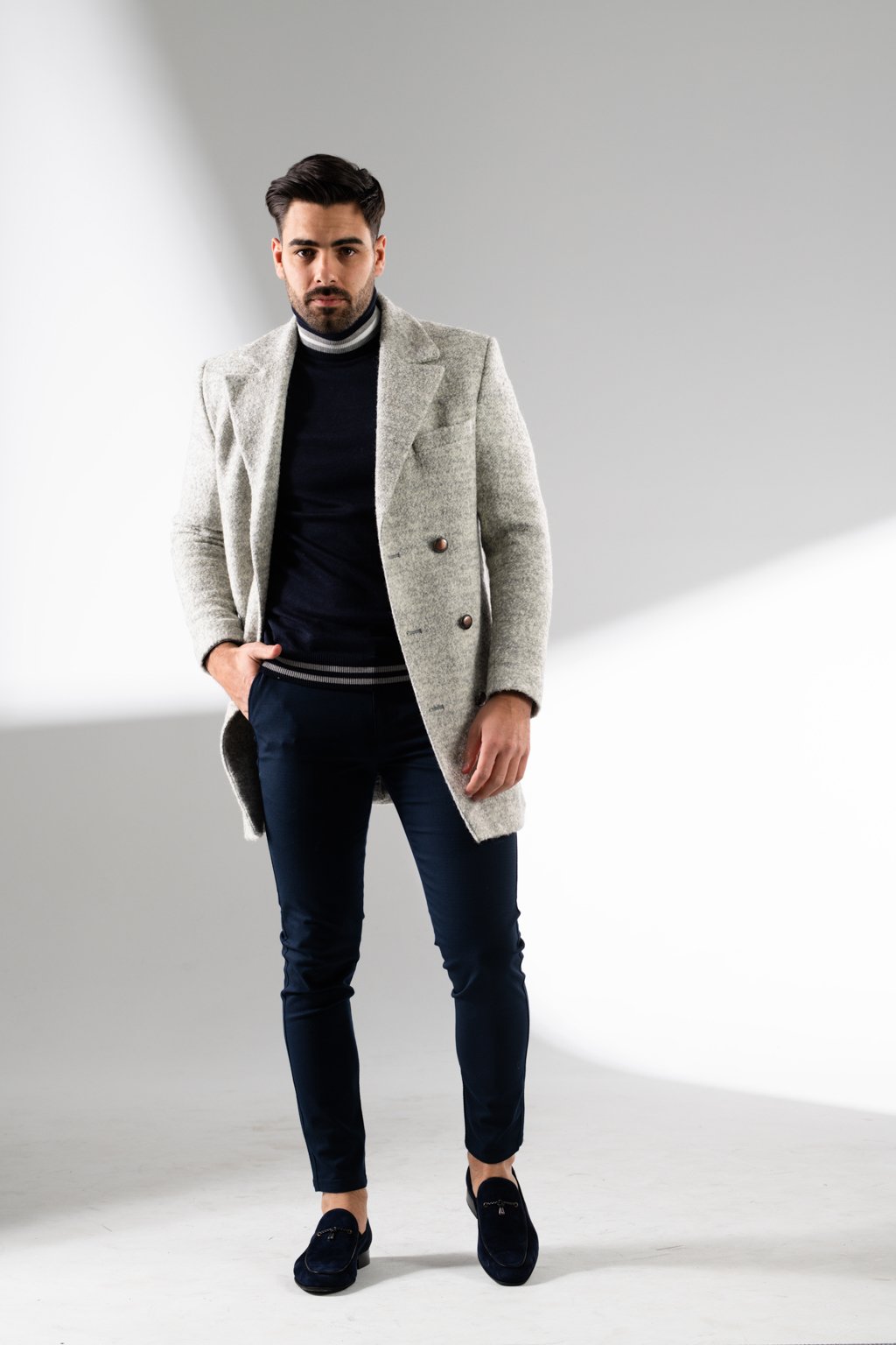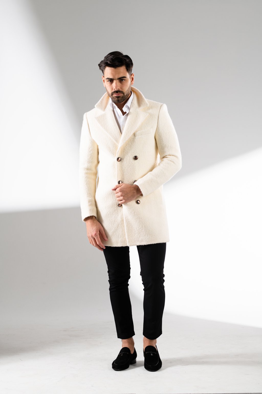 #maindescThe natural fibers of this coat keep their texture whilst shaped into a tailored double-breasted silhouette. Metallic buttons, wide peak lapel and side entry pockets add modern to an ageless look.
